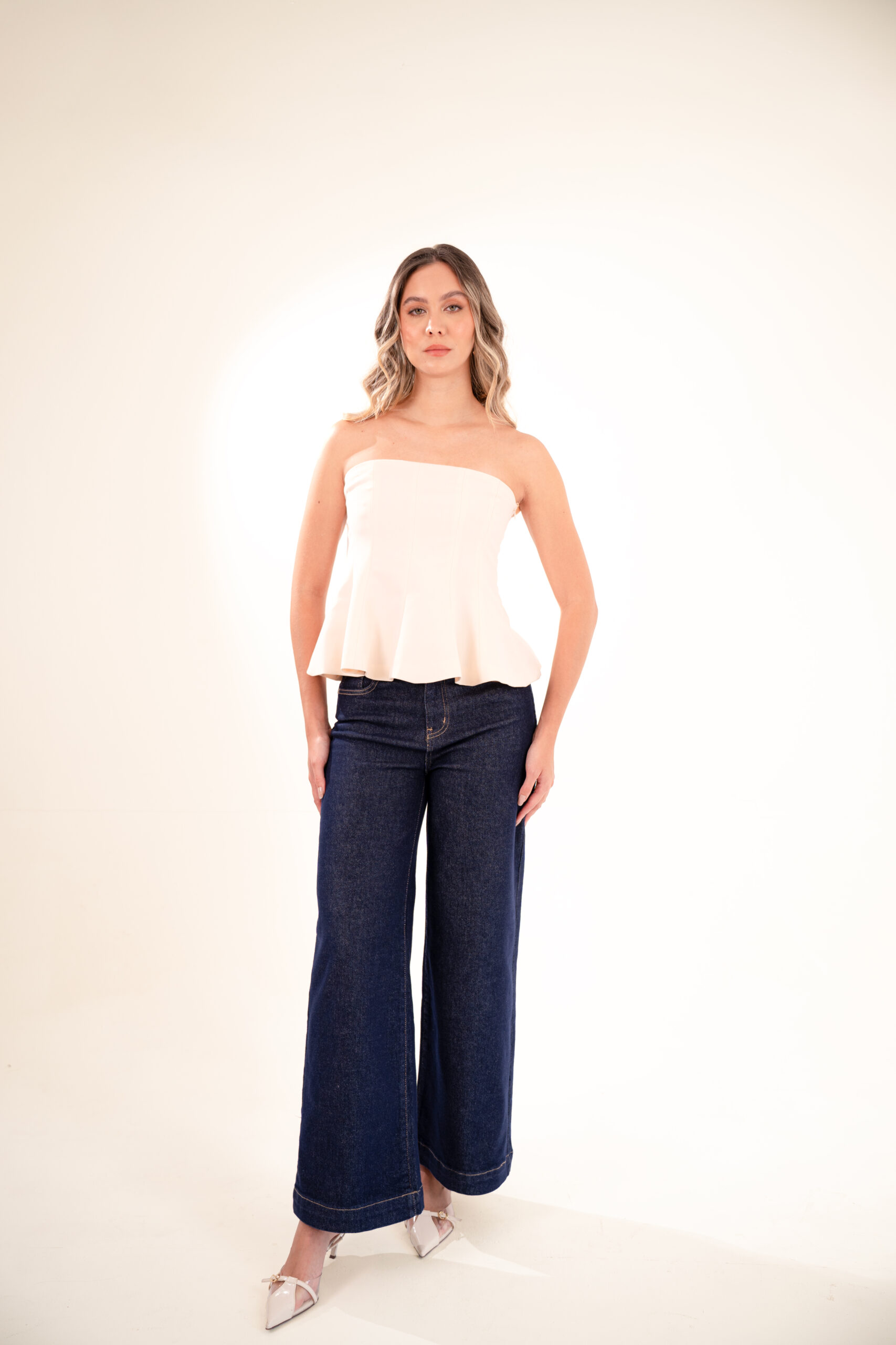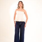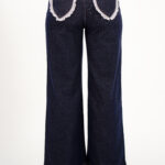 Diseño de bota recta y amplia, con aplicaciones en forma de corazón en encaje blanco que le dan un toque femenino y especial. Confeccionado en denim 100% algodón, ideal para elevar cualquier look.