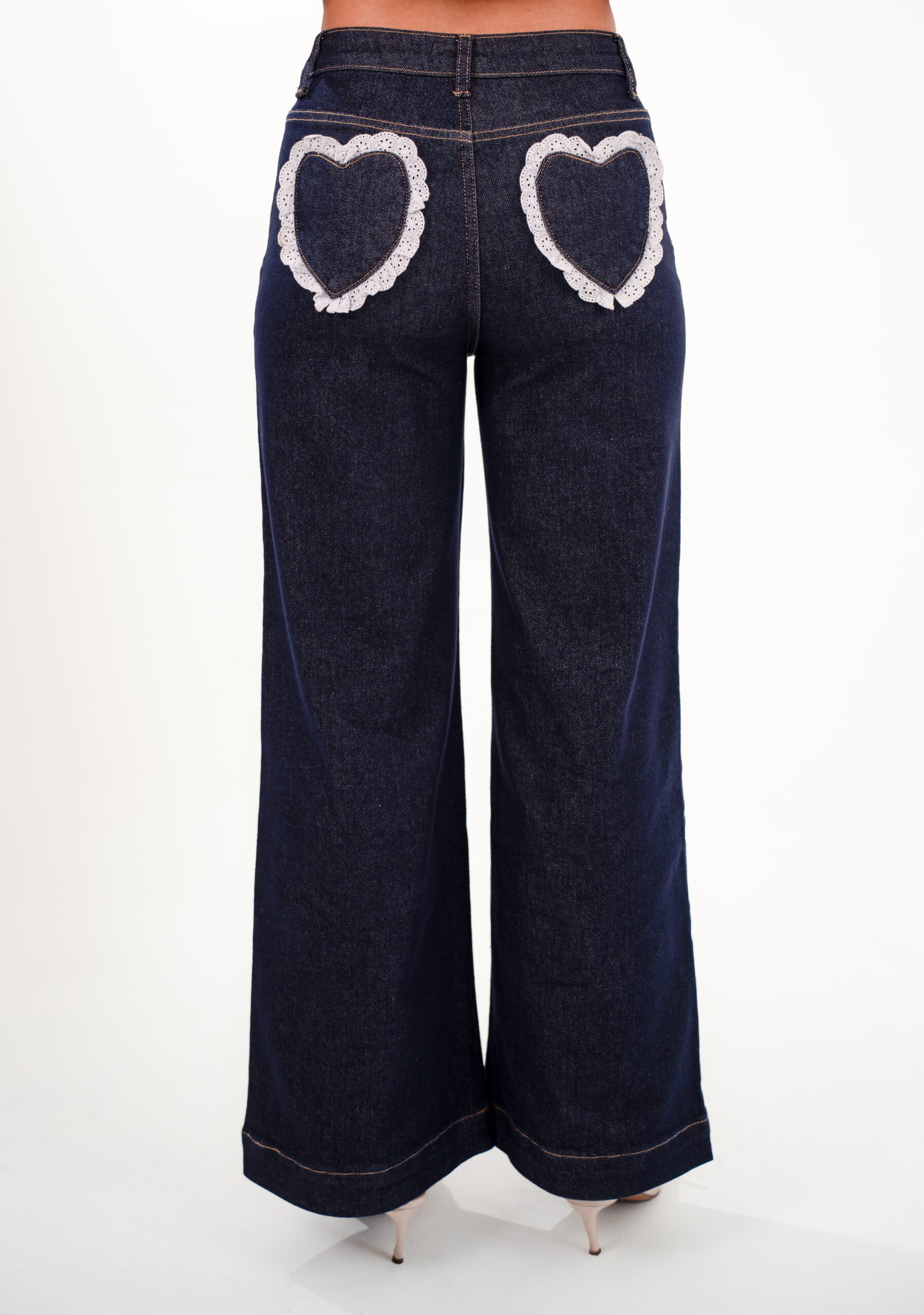 Diseño de bota recta y amplia, con aplicaciones en forma de corazón en encaje blanco que le dan un toque femenino y especial. Confeccionado en denim 100% algodón, ideal para elevar cualquier look.